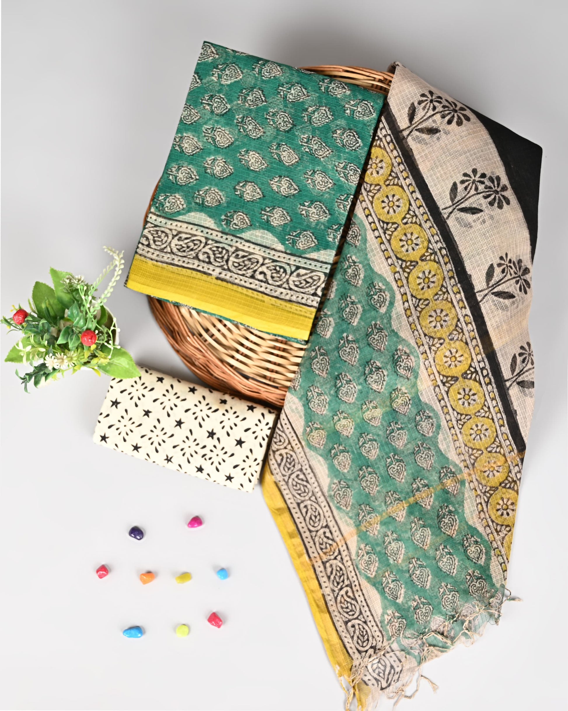 Traditional Hand Block Prints – Showcasing intricate floral and motif block prints in soothing green, beige, and yellow tones, blending classic aesthetics with vibrant appeal.