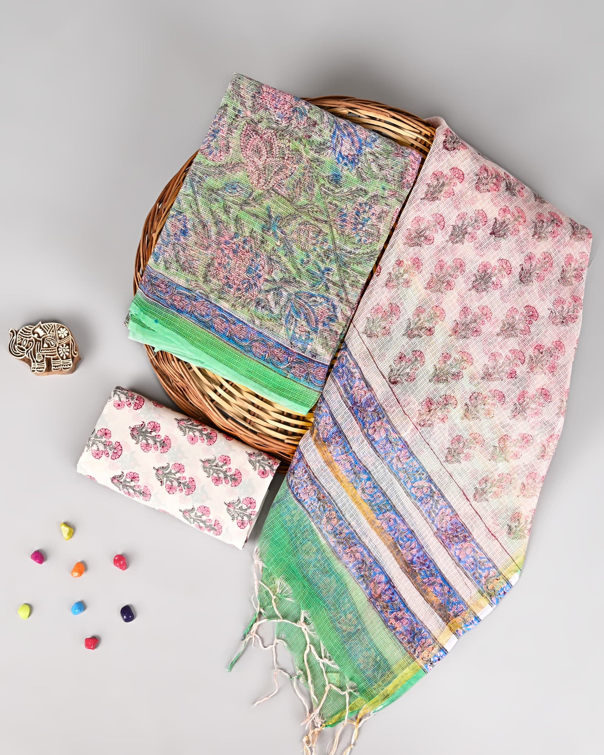 Complete Suit Set – This unstitched ensemble includes 2.5 metres each of Kota Doriya top and dupatta, along with 2.5 metres of coordinated cotton bottom fabric—ready for custom tailoring.